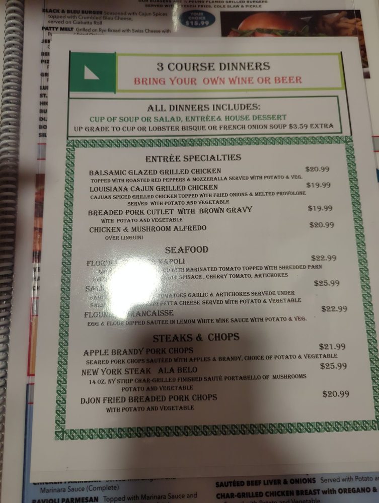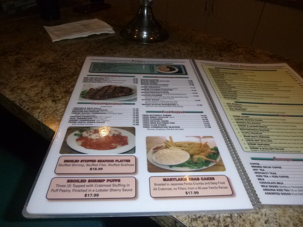 Broiled stuffed shrimp, broiled flounder, sea scallopsand scrod.