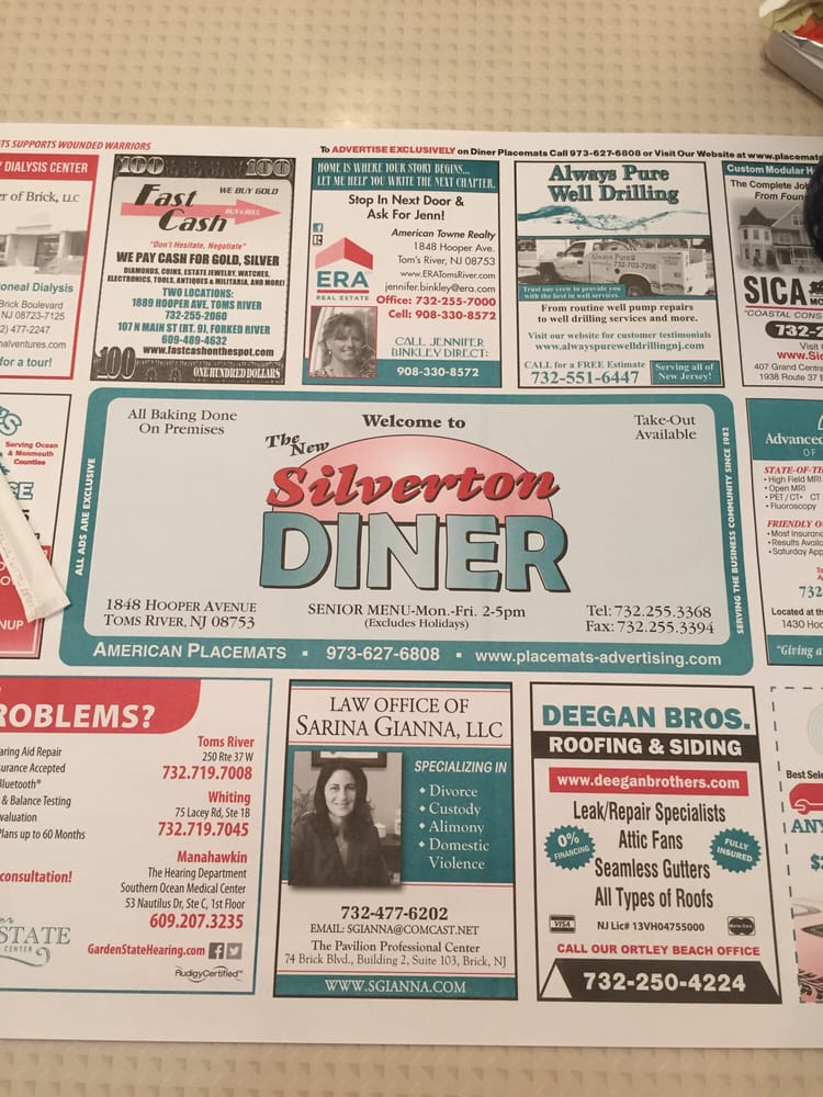 Silverton Diner in Toms River, NJ offers a diverse menu with options for all meals - breakfast, brunch, lunch, and dinner. With a variety of appetizers like Eggplant Fries and Chicken Quesadilla Rolls, homemade soups including French Onion and Lobster Bisque, and fresh garden salads like Caesar Chicken and Antipasto Salad, there is something for everyone. Reviews mention friendly service, good portions, fair prices, and a classic American diner feel. The diner's straightforward approach to serving efficient meals with no fluff is praised by patrons. Silverton Diner also offers unique seasonal specials and a small appetite option for a complete meal. Overall, this diner provides a comfortable and welcoming dining experience with delicious food choices.